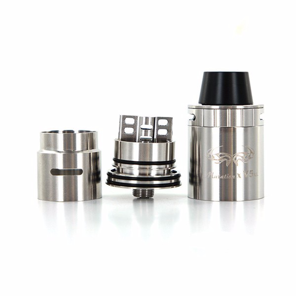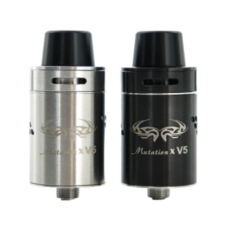 Дрипка Indulgence Mutation X V5 выпускается в черном и стальном вариантах, на корпусе имеется стилизованная эмблема, эффектно дополняющая изделие. Диаметр атомайзер 22 мм, вес всего 55 грмм. Сужающийся кверху мундштук выполняется в черном цвете в обоих версиях.